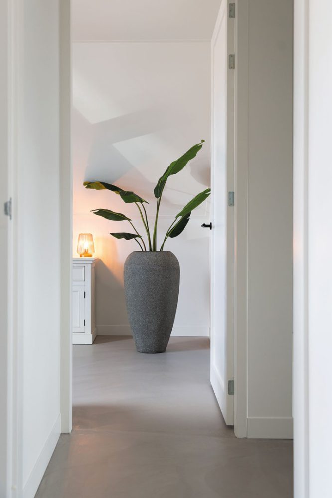 Ze kozen voor een grondwarmtepomp in plaats van een luchtwarm- tepomp. Dit is wel kostbaarder, maar het systeem heeft als voordeel dat het passief kan koelen en minder energie verbruikt. Ze hebben de woning bewust deels casco laten opleveren. Yvo: “We wilden zowel beneden als boven strakke muren en een gietvloer om weer die verbinding te krijgen. Bij een gietvloer op een nieuwe, nog uithardende betonvloer zouden scheurtjes kunnen ontstaan. Bij de wanden hetzelfde. Daarom hebben we daar een jaar mee gewacht met onze oude meubels op een betonvloer gewoond.” Dat jaar ‘bivakkeren’ heeft een perfect resultaat opgeleverd. Het gaf ze ook de tijd om tot de inrichting te komen die ook helemaal bij ze past. Antoinette: “Doordat we in het ontwerp, de indeling en de inrichting vrijwel overal over mee hebben kunnen denken, is dit helemaal ons droomhuis geworden.”